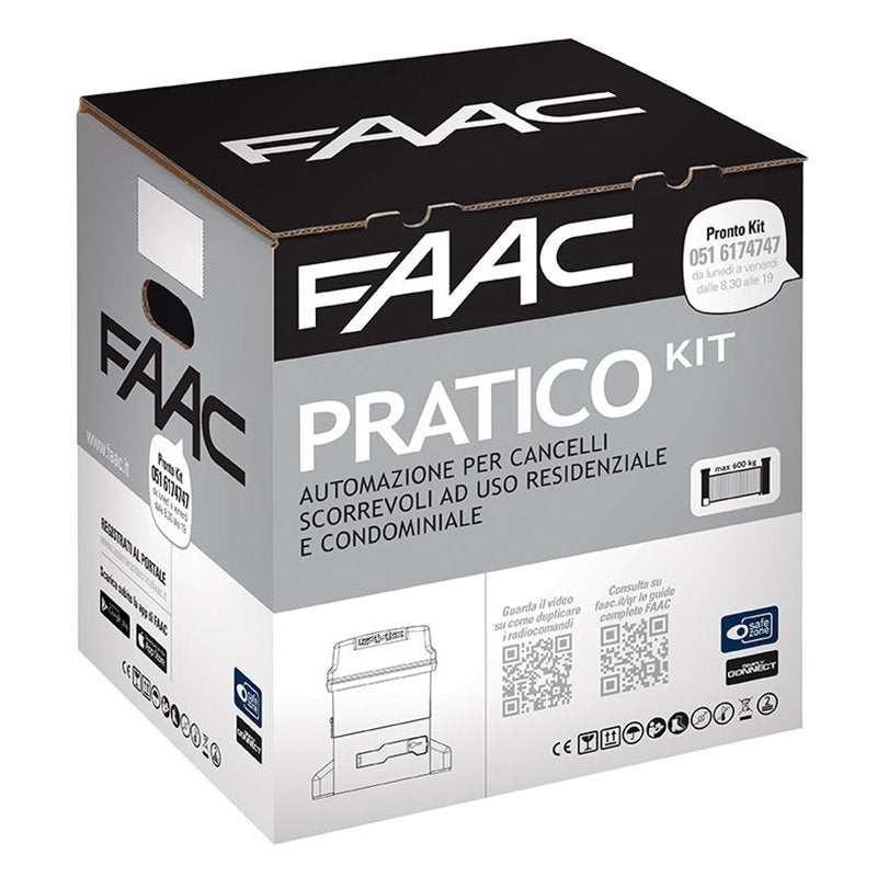 Kitul FAAC PRATICO C 230V este un sistem complet de automatizare pentru porți culisante (glisante) rezidențiale sau comerciale de dimensiuni medii. Echipat cu motorul FAAC 746 C Z16, acest kit oferă putere, fiabilitate și durabilitate superioară, fiind conceput pentru porți cu greutate de până la 600 kg.