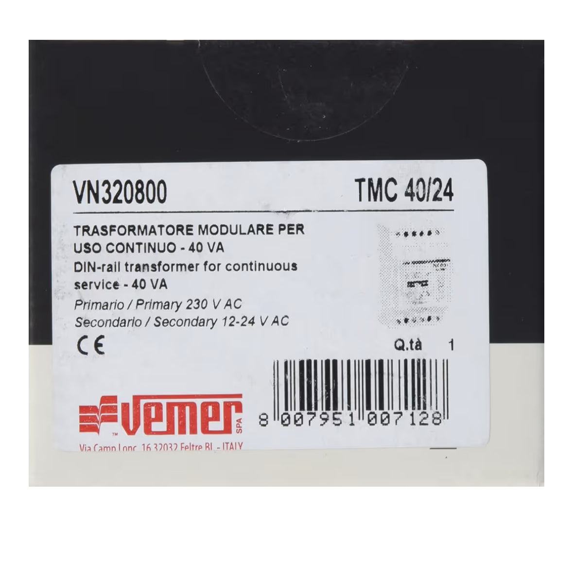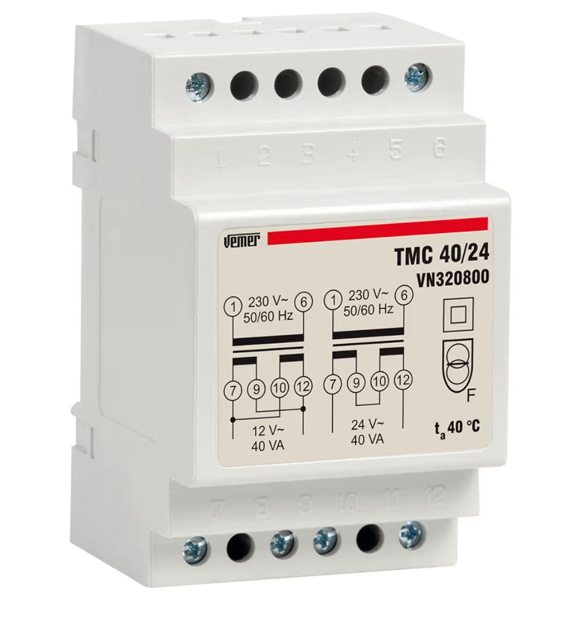 VEMER TMC 40/24 este un transformator de siguranta destinat alimentarii circuitelor de joasa tensiune, utilizat in automatizari, sisteme de control, comanda si instalatii electrice unde este necesara conversia tensiunii de la 230V AC la 12V AC.